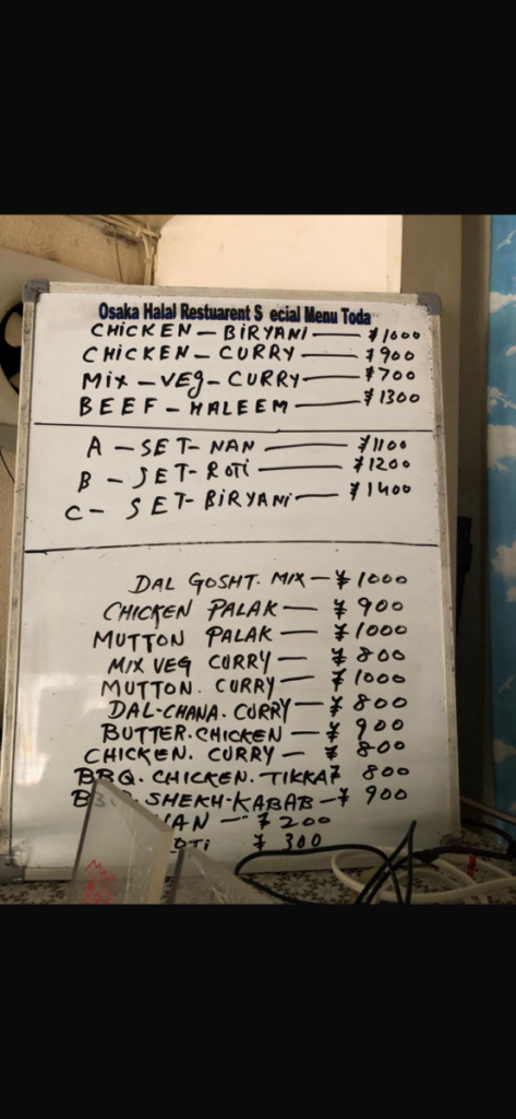 Today menu Osaka halal restaurant | 大阪ハラールレストラン